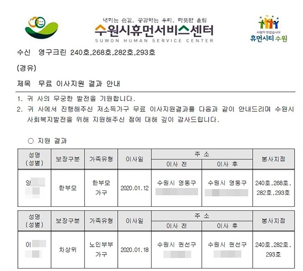 2020년 1월 12일 240호, 268호, 282호, 293호 무료 이사 지원 서비스