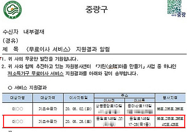 2020년 3월 28일 66호, 235호, 265호, 412호, 428호 무료 이사 지원