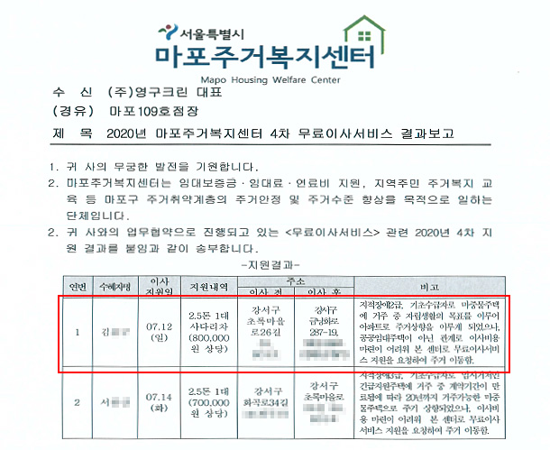 2020년 7월 12일 109호 무료 이사 지원 서비스
