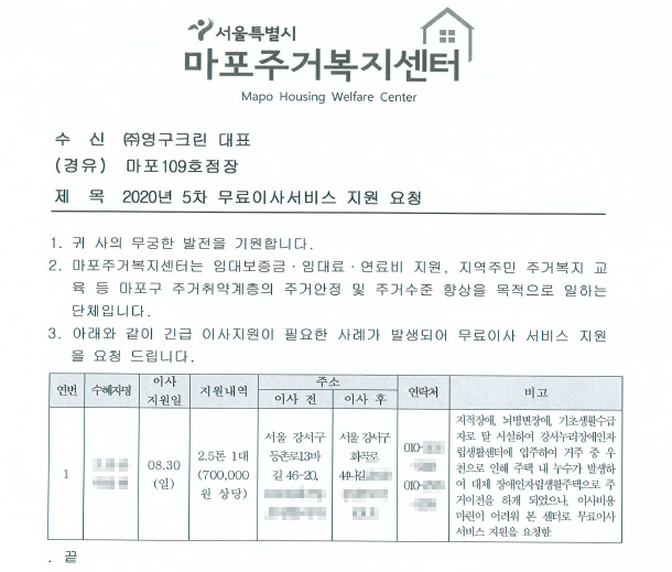 2020년 8월 30일 109호 무료 이사서비스