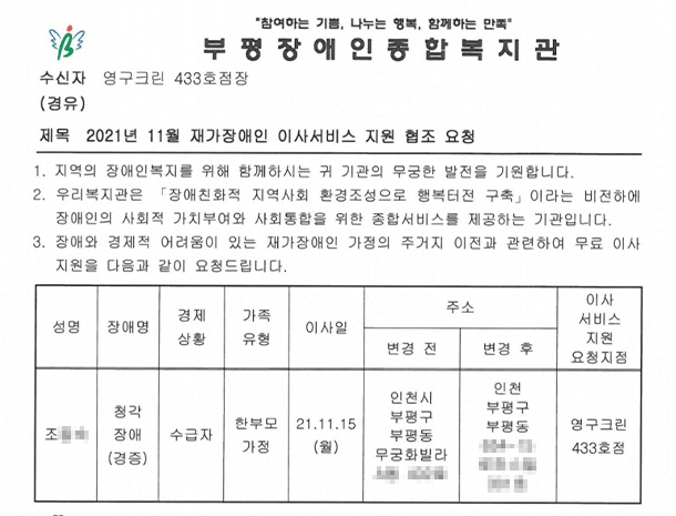 2021년 11월 15일 433호 무료 이사 지원 서비스