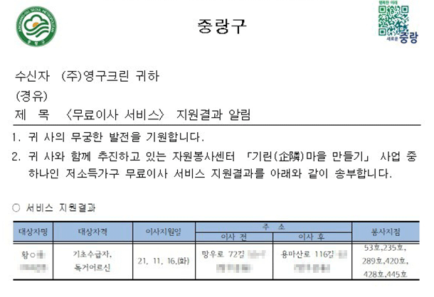 2021년 11월 16일 53호, 235호, 289호, 420호, 428호, 445호 무료이사지원
