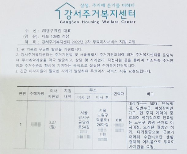 2022년 3월 27일 109호 무료 이사 지원 서비스