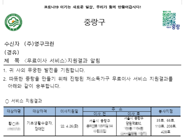 2022년 4월 26일 35호, 66호, 113호, 208호, 428호 무료이사지원서비스