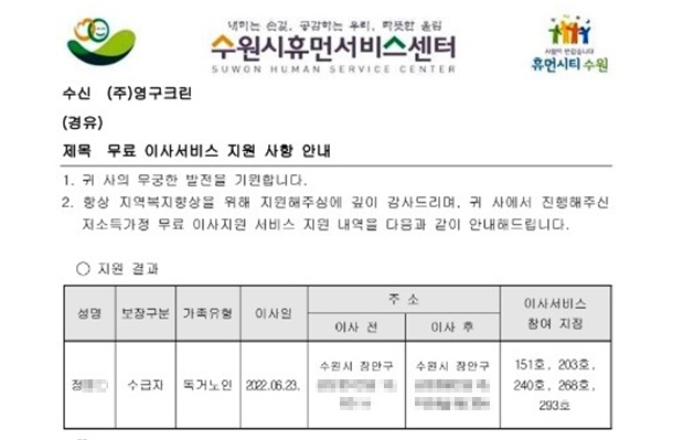 2022년 6월 23일 151호, 203호, 240호, 268호, 293호 무료이사지원서비스