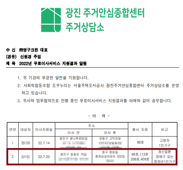 2022년 7월 20일 66호, 113호, 208호, 409호 무료이사지원서비스