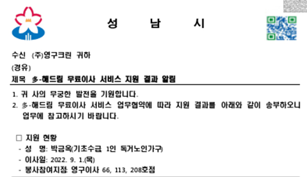 2022년 9월 1일 66호, 113호, 208호 무료 이사 지원 서비스