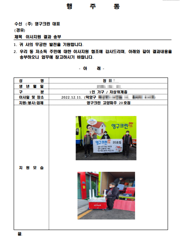2022년 12월 11일 20호점 무료 이사 지원 서비스