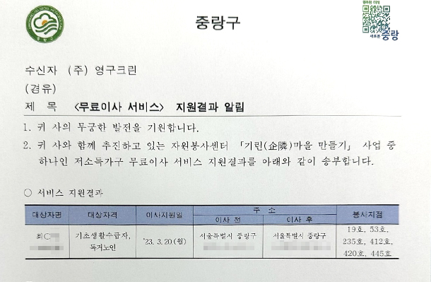 2023년 3월 20일 19호, 53호, 235호, 420호, 445호 무료이사지원서비스