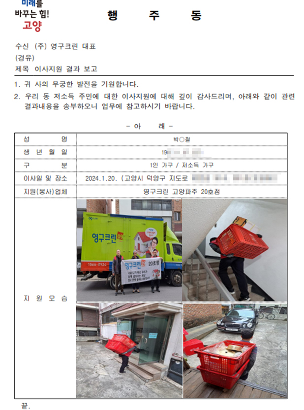 2024년 1월 20일 20호점 무료 이사 지원 서비스