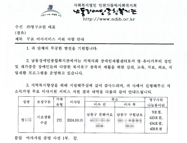 2024년 10월 15일 9호, 433호, 434호, 458호 무료이사지원서비스