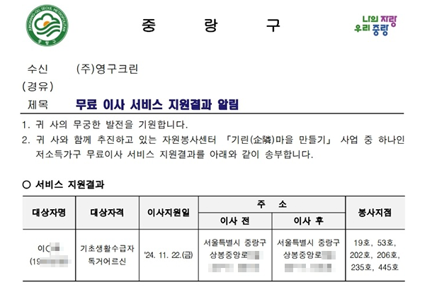 11월 22일 19호, 53호, 202호, 206호, 235호, 445호 무료 이사 지원