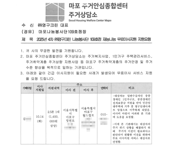 2025년 10월 14일 나눔봉사단 109호 무료 이사 지원 서비스