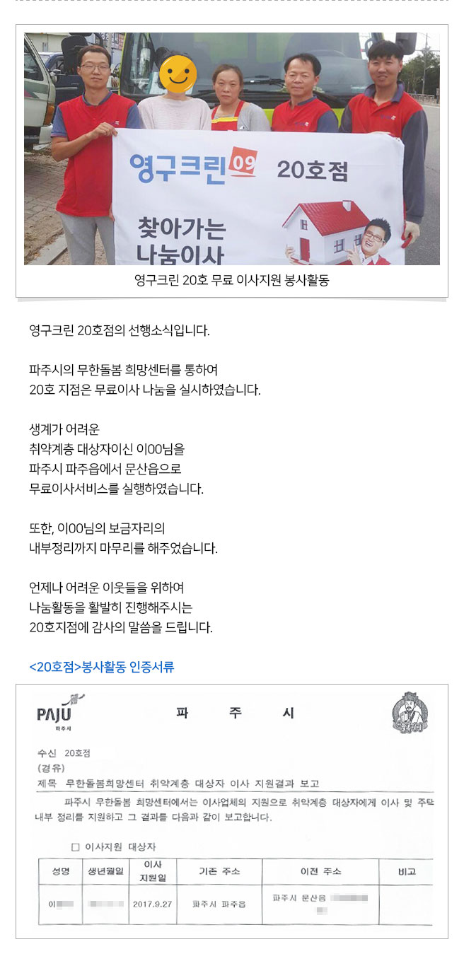 영구크린 20호점의 선행소식입니다. 파주시의 무한돌봄 희망센터를 통하여 20호 지점은 무료이사 나눔을 실시하였습니다. 생계가 어려운 취약계층 대상자이신 이00님을 파주시 파주읍에서 문산읍으로 무료이사서비스를 실행하였습니다. 또한, 이00님의 보금자리의 내부정리까지 마무리를 해주었습니다. 언제나 어려운 이웃들을 위하여 나눔활동을 활발히 진행해주시는 20호지점에 감사의 말씀을 드립니다.