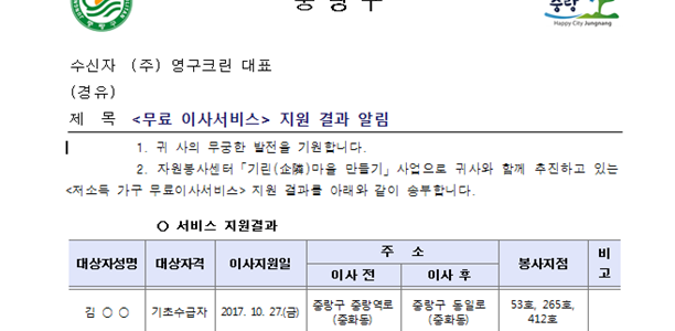 신청인 김OO님은 가정형편의 어려움으로 인하여 나라에서 지정한 기초 생활수급자 입니다. 중랑구 기린마을은 지난 2010년 중랑구 자원봉사센터에 만들어진 무형의 마을로 봉사와 나눔에 뜻이 있는 기업의 사회공헌활동 프로젝트를 개발하고 함께 사업을 추진하면서 상생과 나눔을 실현하고 있습니다. 훌륭한 프로젝트에 매월 동참하고 있는 영구크린 53호, 265호, 412호 지점에 박수를 드립니다. 감사합니다. |