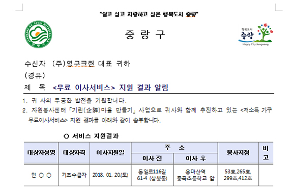 2018년 1월은 경제적 어려움이 있는 기초수급자 민OO님을 대상으로 중랑구 상봉동에서 중곡동으로 이사 진행을 실시하여 봉사활동이 진행되었습니다.