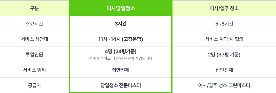 이사당일청소의 경우 사전에 약속된 청소 확보시간이 보장되지 않을시 청소 범위 변경 및 추가금액이 발생할 수 있습니다.
