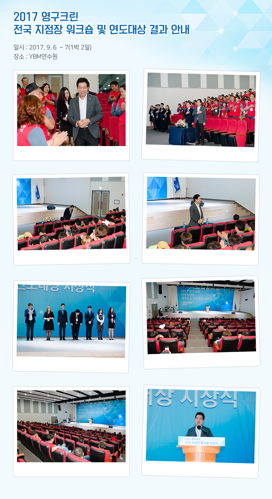 2017년도 (주)영구크린 전국 지점장 워크숍 및 연도대상이 경기도 화성시 YBM연수원에서 진행되었습니다.